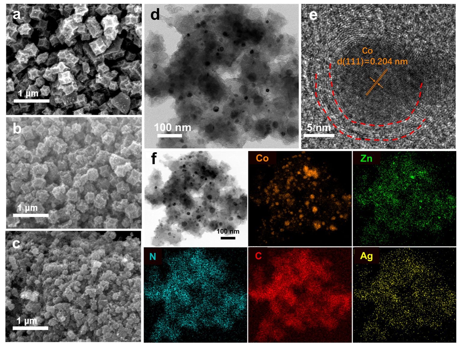 图1 (a) Co-NC、(b) Co/Zn-NC和(c)Ag@Co/Zn-NC样品的SEM图、Ag@Co/Zn-NC样品的(d) TEM图、(e)高分辨TEM、(f)元素分布图