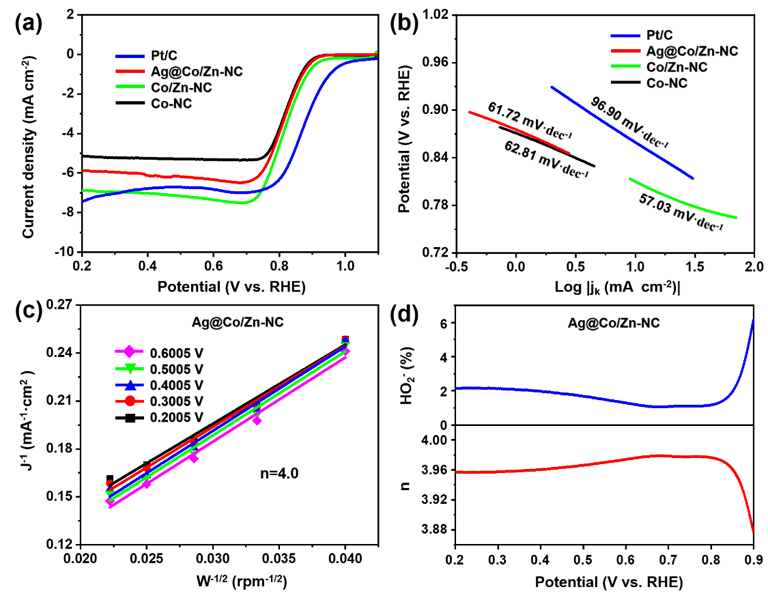 图3 (a) LSV曲线、(b)塔菲尔斜率、(c)K-L方程计算的电子转移数、(d)旋转的圆环电极计算的HO− 2产率(上)和电子转移数(下)