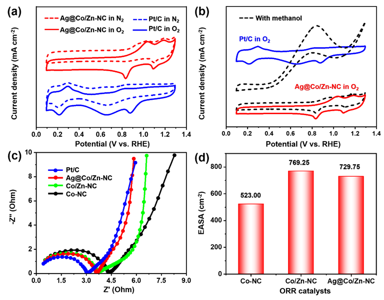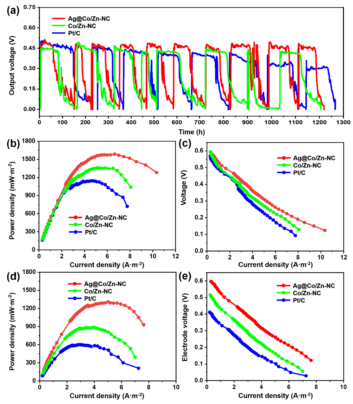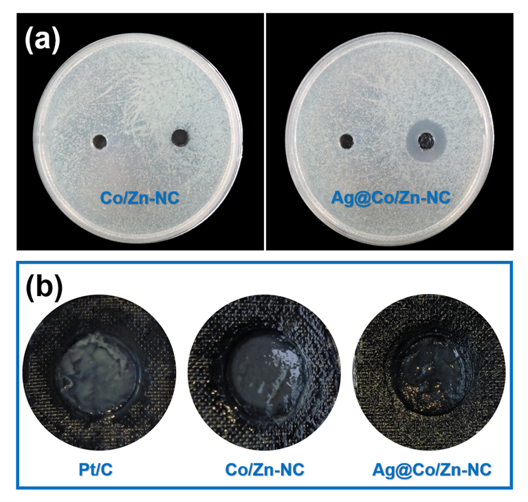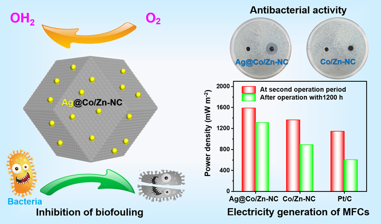 因此,该项研究工作将抗菌纳米Ag材料与Co/Zn-NC催化材料相融合,两组分在构建高性能阴极催化剂Ag@Co/Zn-NC中协同发挥各自的功能优势,通过抑制生物污染来增强阴极氧还原催化剂的耐用性。本工作为构筑抗生物污染的阴极氧还原催化剂提供了技术参考,为实现微生物燃料电池长期循环高效产电提供了一种可借鉴的策略。