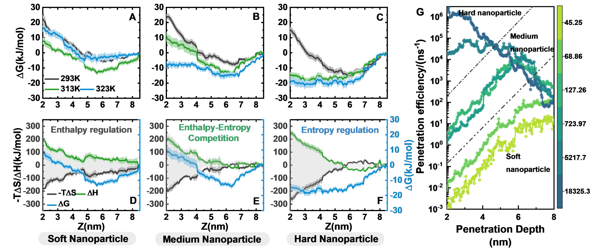 图3.弹性纳米颗粒生物膜穿透的变形焓-熵竞争证据:(A-C)弹性纳米颗粒穿透膜过程中随深度变化的吉布斯自由能ΔG,(E-F)熵贡献-TΔS,焓贡献ΔH,以及(G)随深度变化的穿透效率。