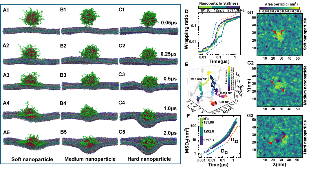 图2.不同弹性纳米颗粒(NPs)细胞穿透的内在动力学: (A-C)代表性快照, (D)膜包裹的典型时间序列记录, (E)弹性NP轨迹, (F)结构变形因子,以及(G1-G3)脂质膜的二维面积。快照颜色与图2A-2C相似。杨氏模量分别为68.9 kPa(软)、127.3 kPa(中)、5.2 MPa(硬),与后续研究中记录的数值一致。