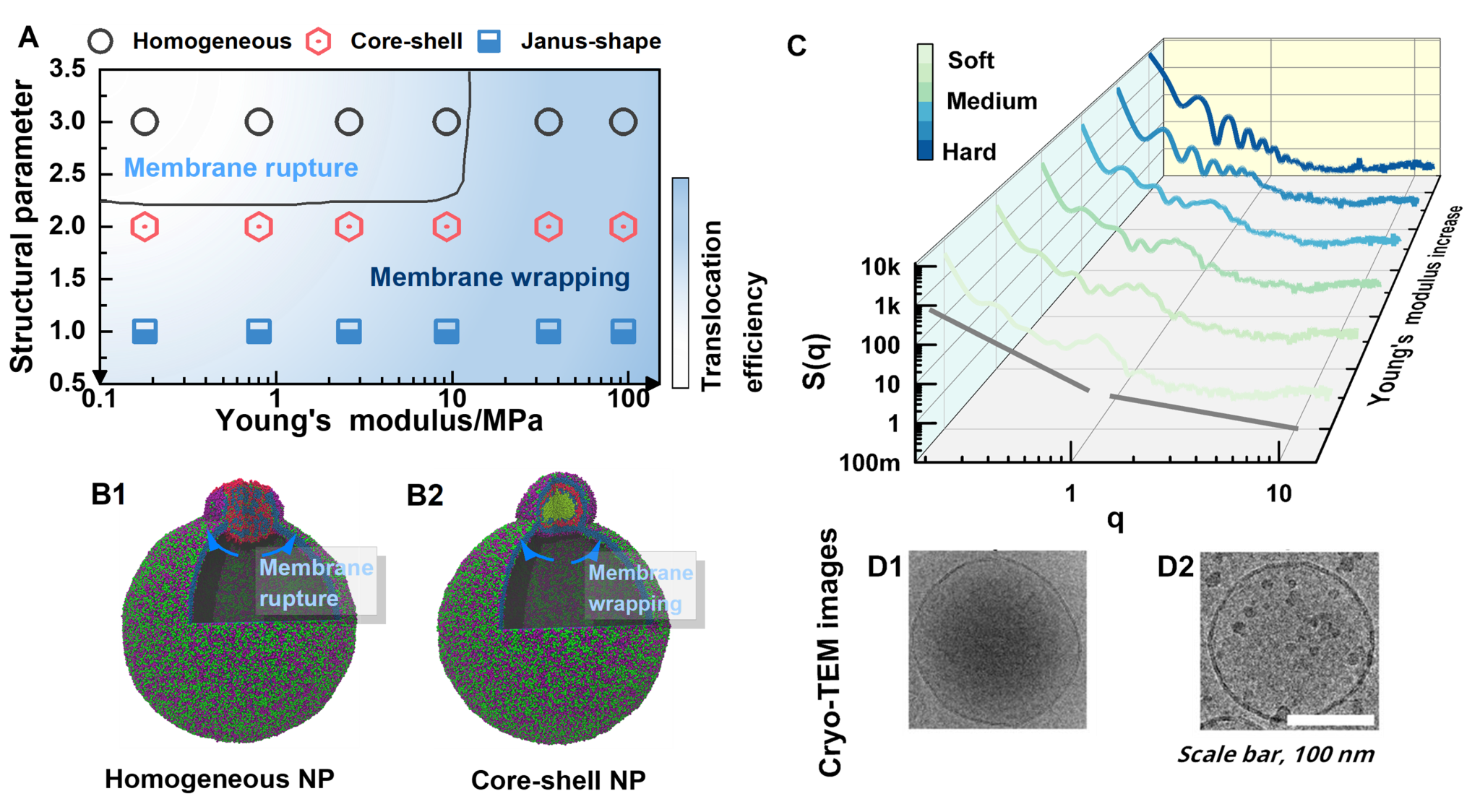 图5.结构异质性与网络弹性在可变形聚合物NP细胞内化中的关系:(A)在不同机械强度和内部结构构型下内化路径和易位效率的示意图;(B)内化模式的代表性快照;(C)NP的静态结构因子;以及(D)实验性透射镜图像,显示嵌入水凝胶中的脂质纳米囊泡。易位效率由平衡态下的包裹比决定。(D)中的透射电子元件图像经Yu等人许可改编。