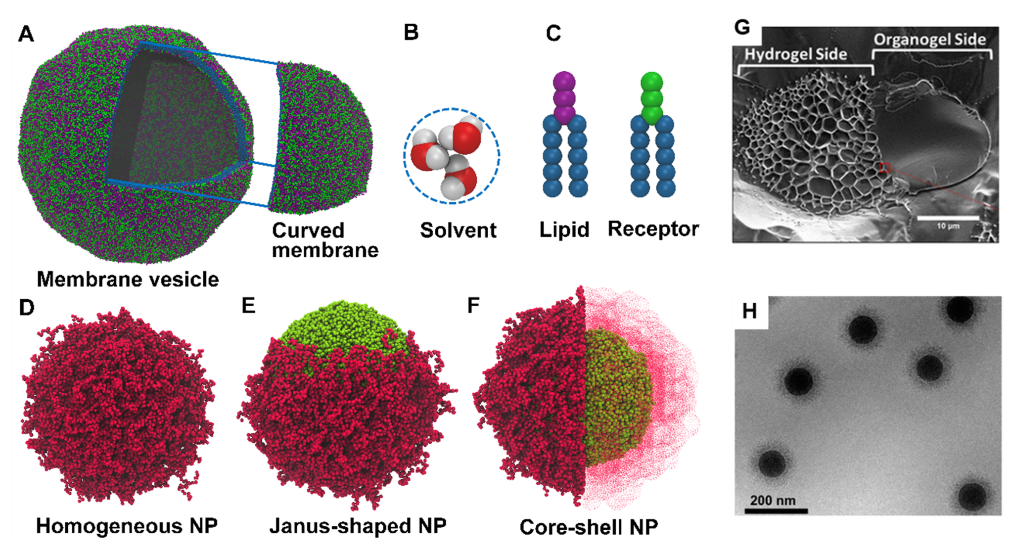 图4.粗粒度模型示意图,针对(A)膜囊泡,(B)溶剂,(C)脂质和受体,(D-F)具有多种结构的高分子NP,以及(G)核壳和(H)Janus非泡的冷冻扫描电镜图像。在聚合物NP模型中,亲水性PEG段用红色颗粒表示,而疏水段则用青蓝色颗粒表示。脂质和受体头由粉色和绿色颗粒表示,而脂质和受体尾部则由深蓝色颗粒表示。聚乙二醇二丙酸酯/聚丙二醇二丙烯酸酯Janus NP经参考文献许可复制。