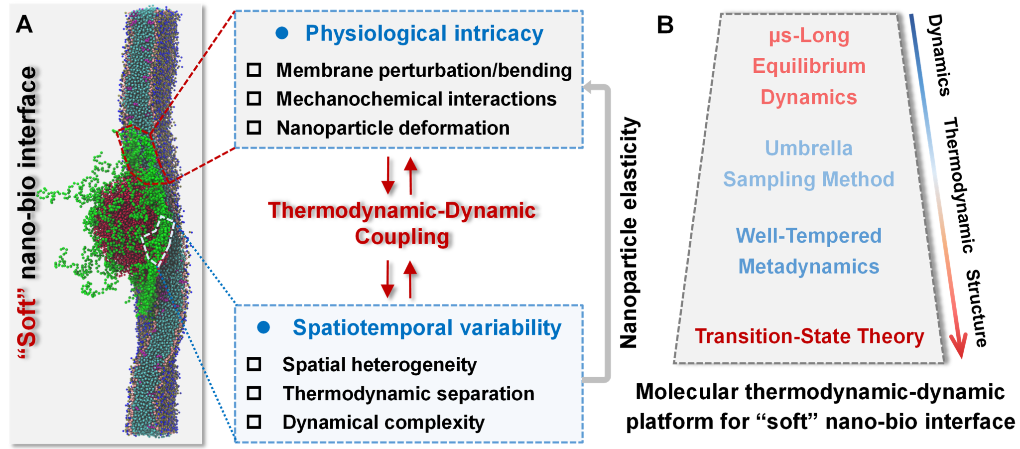 图1. (A)“软”纳米-生物界面的生物屏障示意图,具有时空异质性的特殊性质,(B)分子热力学-动力学(MTD)平台,考虑了微秒级的长期平衡动力学、伞式采样方法、良好调节的元动力学以及过渡态理论。对于快照(图1A),绿色表示亲水区,红色表示核壳纳米粒子的疏水区,溶剂和盐被省略以便清晰展示“软”纳米-生物界面。