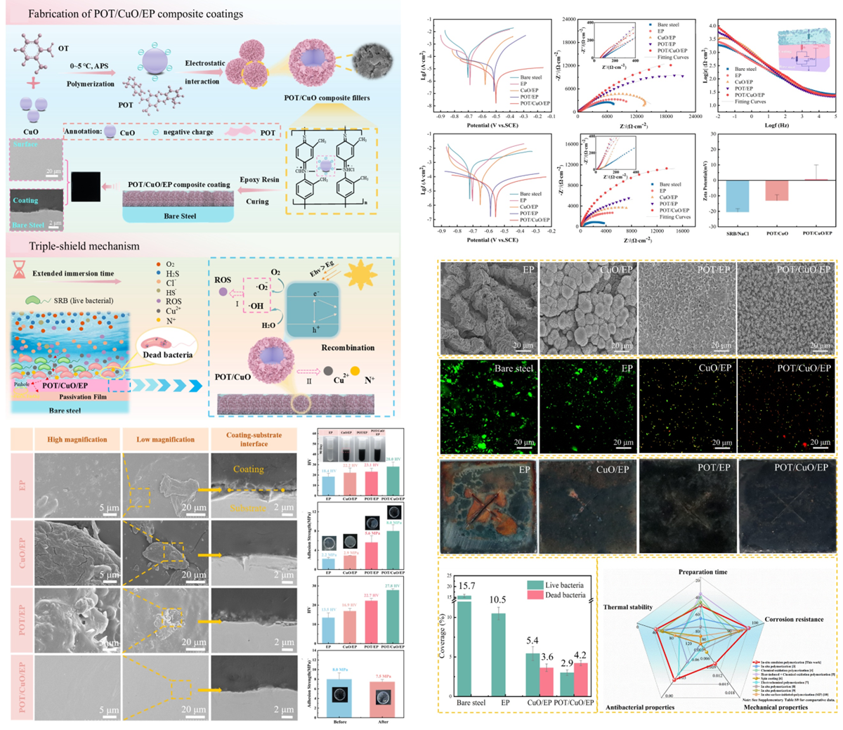 POT/CuO/EP复合涂层附着力强(8.0 ± 1.3 MPa),在含SRB的3.5% NaCl溶液中长期浸泡(14及70天)后,其防腐性能显著优于单一组分涂层,并能有效抑制SRB生物膜的形成。其防护机制包括三重协同作用:(1)化学钝化:POT在钢表面促进γ-Fe2O3/Fe3O4钝化层的生成;(2)物理阻隔:CuO与POT协同形成致密屏障,延长腐蚀介质(O₂、Cl⁻、HS⁻)的渗透路径;(3)主动抗菌:CuO释放的Cu2⁺与POT的N⁺基团协同破坏SRB细胞膜,抑制其代谢与附着。该涂层通过整合物理、化学与抗菌功能,为海洋及油气设施中的金属防护提供了有前景的解决方案。该工作以“A triple-shield strategy integrating conductive polymer, biocide, and binder against microbiologically influenced corrosion”为题发表在工程技术类SCI期刊《Chemical Engineering Science》(影响因子4.3)。2022级硕士生张思和2023级硕士生黑鲜玲为论文共同第一作者,重庆三峡学院胡传波副教授和香港浸会大学任康宁教授为论文共同指导教师。